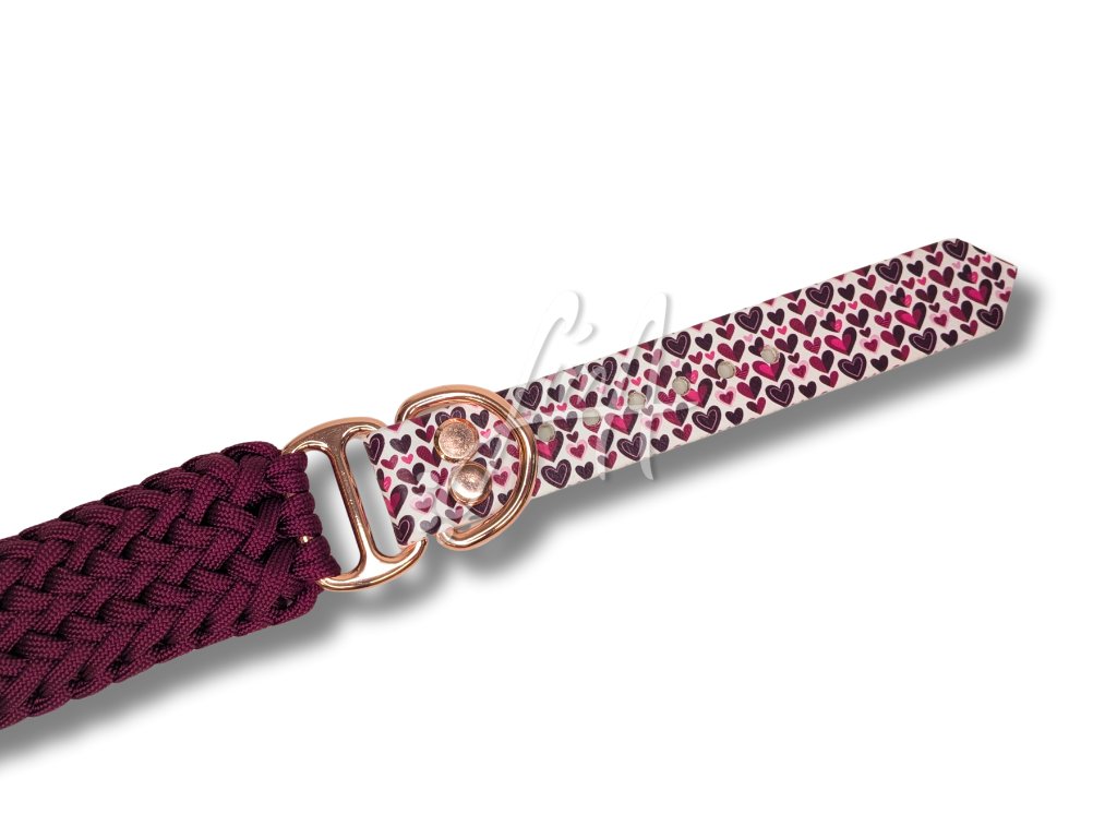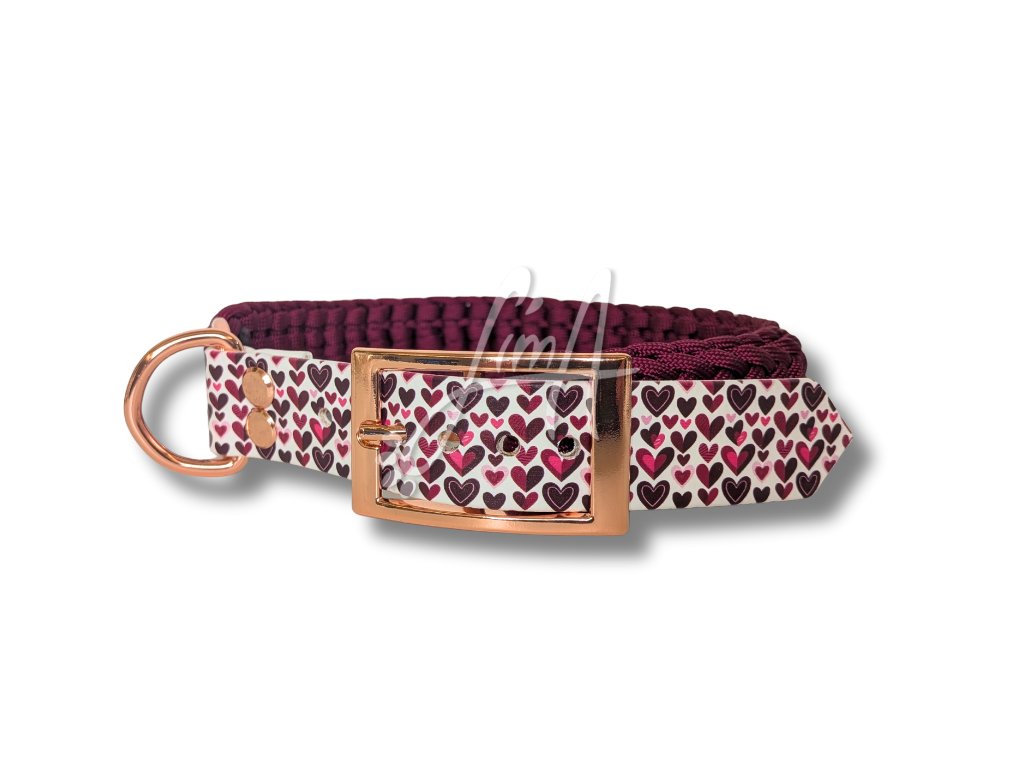 Vínový paracordový náplet v kombinaci s bílým ColorThanem s jemnými srdíčky v odstínech růžové a vínové. Celek nádherně doplňuje zlatorůžové kování, které dodává obojku luxusní a slavnostní vzhled.