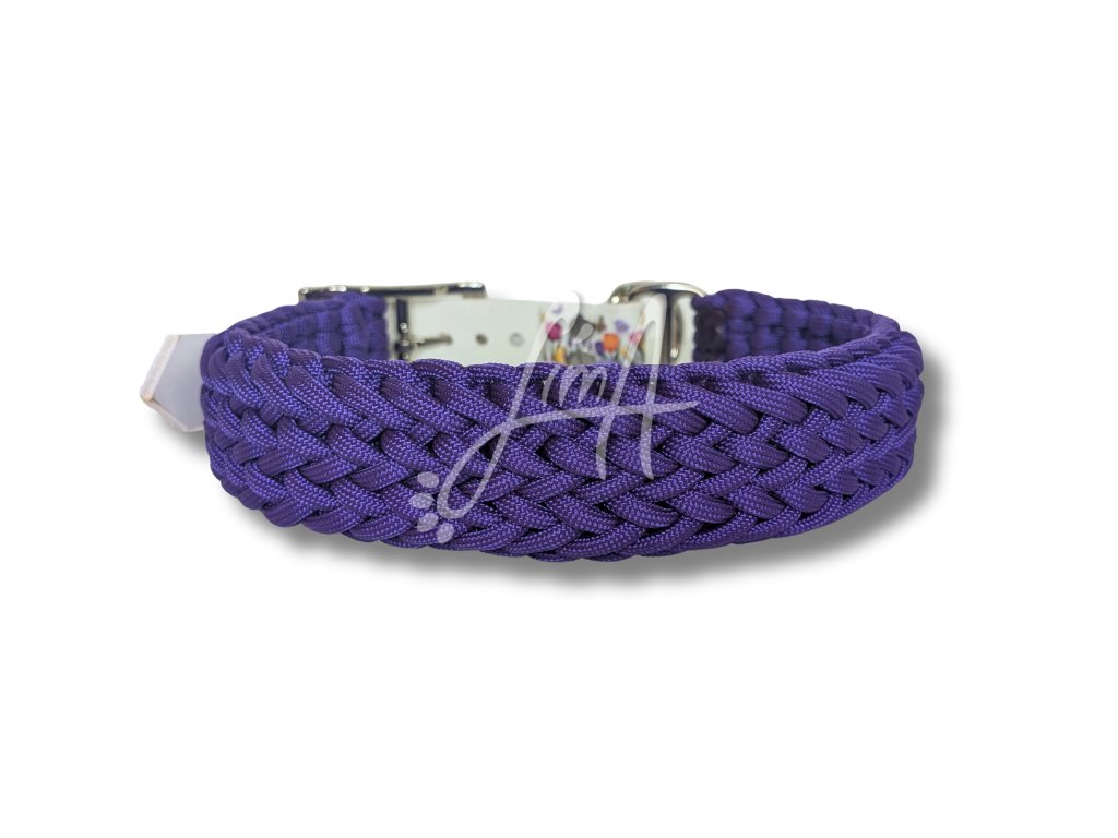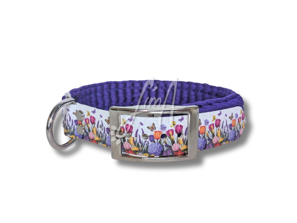 Elegantní fialový paracordový náplet doplňuje jemný květinový ColorThan s motivem tulipánů. Obojek působí romanticky, svěže a velmi vkusně – ideální volba pro ty, kteří mají rádi detail, ale nechtějí křiklavé vzory.