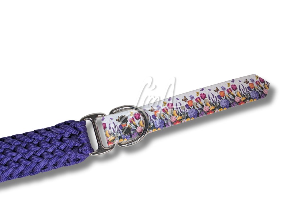 Simply Tulipán spojuje jednoduchost, eleganci a ruční precizní práci. Fialový paracordový náplet z českého materiálu perfektně ladí s jemným květinovým ColorThanem (UV potištěný BioThane® v šíři 25 mm).
